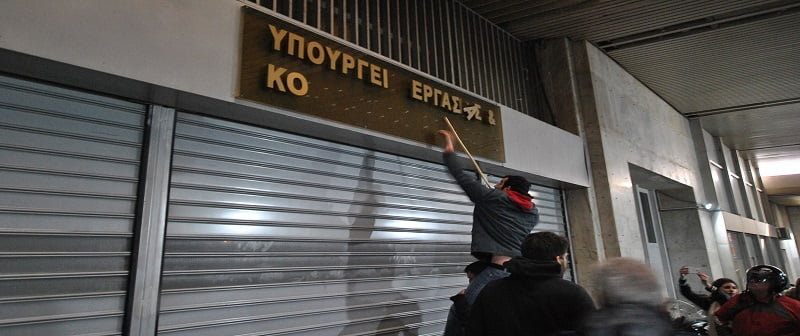 ρίχνοντας παράλληλα στην είσοδο τα γράμματα της ταμπέλας του Υπ. Εργασίας που είχαν ξηλώσει νωρίτερα.