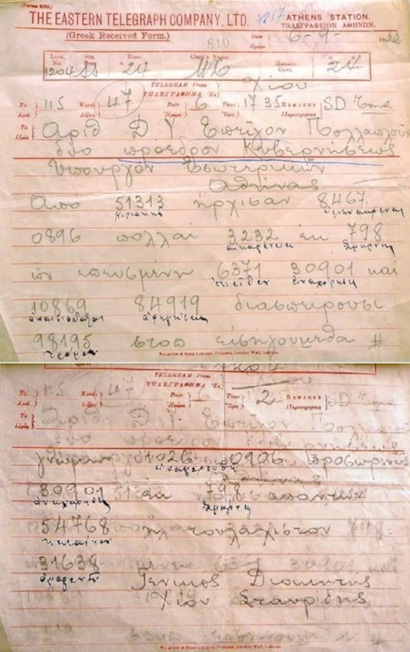 Είναι κρυπτογραφημένο και το απευθύνει ο γενικός διοικητής Χίου Ιωάννης Σταυρίδης προς τον πρωθυπουργό Πέτρο Πρωτοπαπαδάκη και τον υπουργό εσωτερικών Νικόλαο Στράτο. Το αξιοσημείωτο είναι ότι η αποκρυπτογράφηση έγινε απ’ ευθείας πάνω στο πρωτότυπο, προφανώς λόγω βιασύνης: