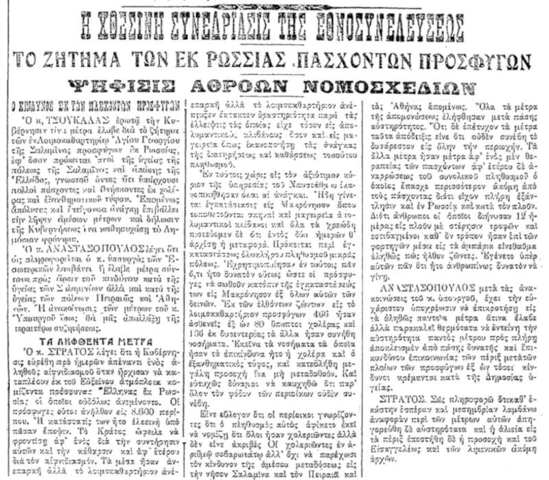 «Μετά την λήξιν της συνεδριάσεως (σ.σ.: της εθνοσυνελεύσεως) συνήλθε το Υπουργικόν Συμβούλιον εις σύσκεψιν καθ’ ην συνεζητήθη το ζήτημα της εγκαταστάσεως των προσφύγων. Απεφασίσθη δε όπως εγκατασταθούν όλοι εις την Μακρόνησον. Προς τούτο θα εγκατασταθούν σήμερον συνεργεία όπως συμπήξουν παραπήγματα και σκηνάς. Θ’ αρχίση δε και η τροφοδοσία των. Μετά την απολύμανσίν των και την εξυγίανσιν θα τοποθετηθούν εις διάφορα μέρη και άλλοι παρά ταις οικογενείαις των».[2]
