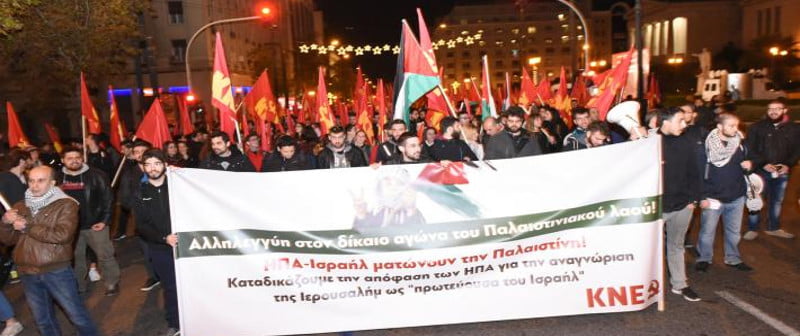 2. Η απόφαση αυτή δυναμιτίζει τη δίκαιη πάλη του λαού της Παλαιστίνης ενάντια στην ισραηλινή κατοχή και για τη δημιουργία και αναγνώριση του παλαιστινιακού κράτους στα σύνορα του 1967 και με πρωτεύουσα την Ανατολική Ιερουσαλήμ.