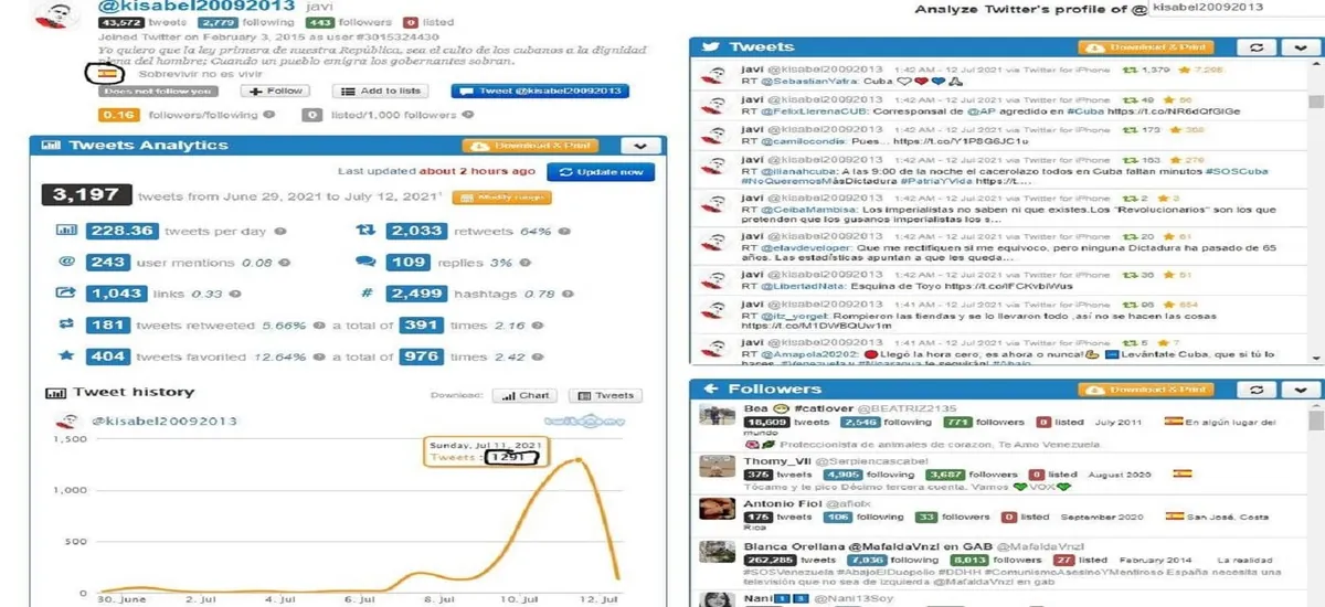 — Ο πρώτος λογαριασμός που χρησιμοποίησε το hashtag #SOSCuba με περιεχόμενο σχετικό με τη διαχείριση της πανδημίας από την Κουβανική κυβέρνηση έχει τη σημαία της Ισπανίας στο προφίλ του και δημοσίευσε περισσότερα από 1.000 tweets στις 10 και 11 Ιουλίου, πραγματοποιώντας 5 retweets ανά δευτερόλεπτο.